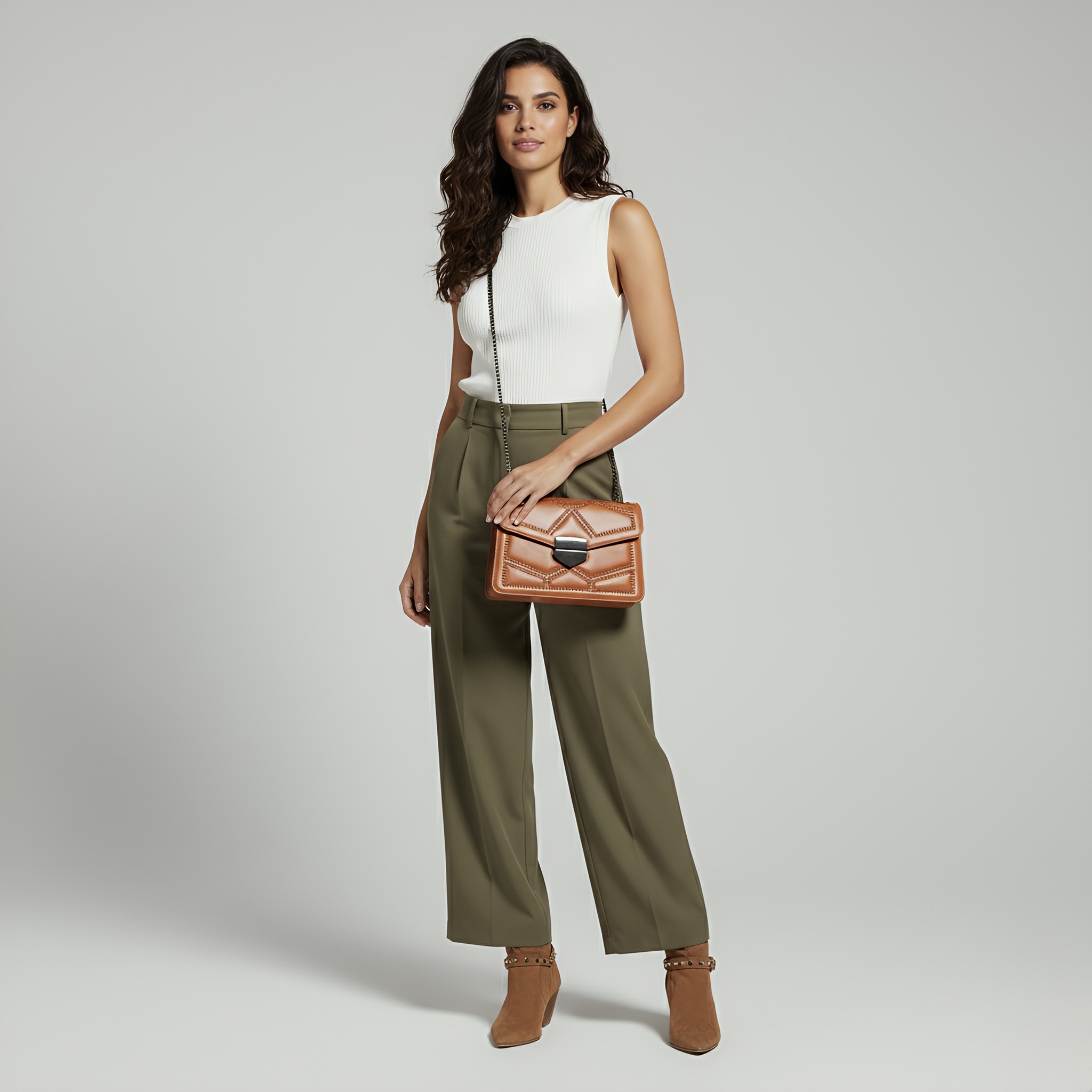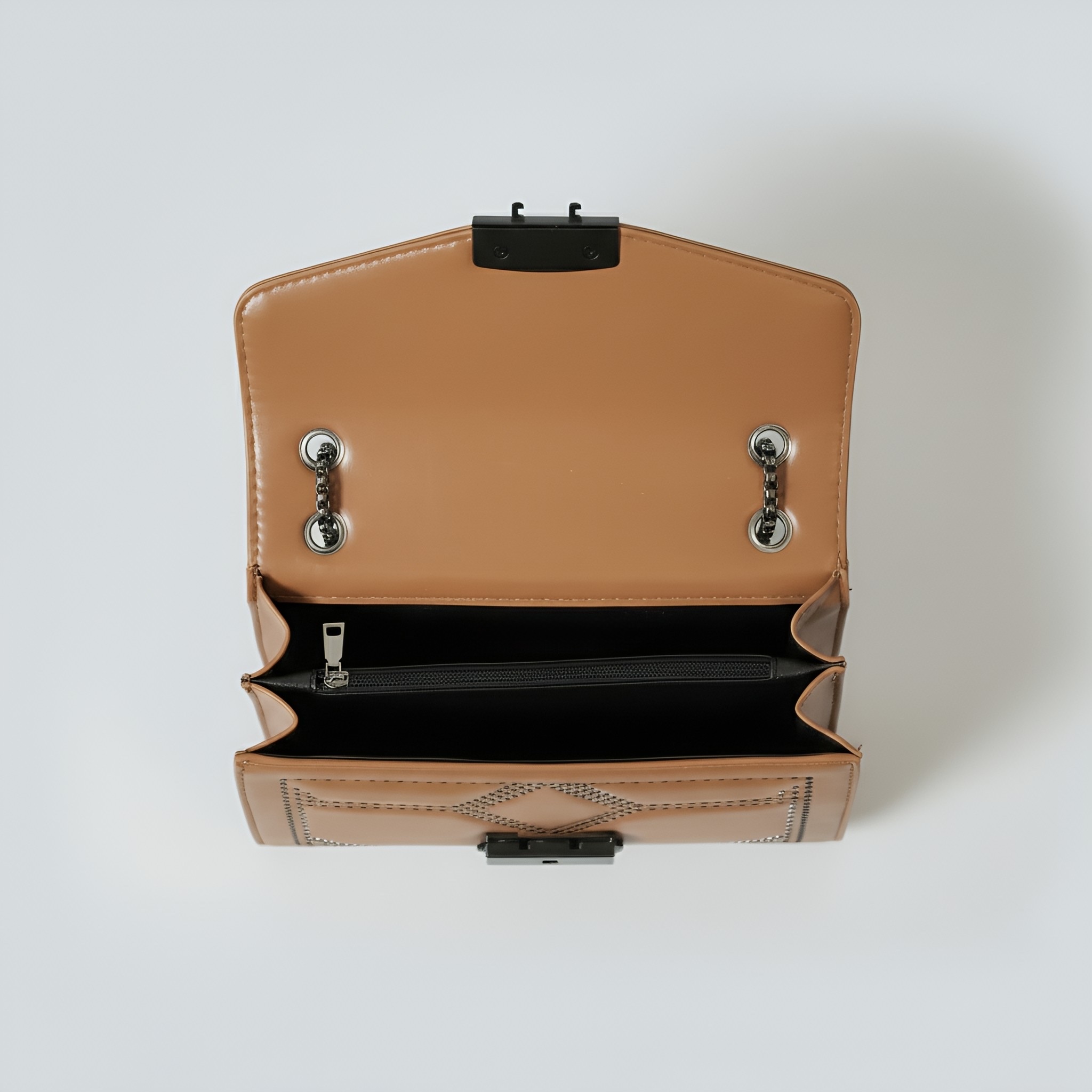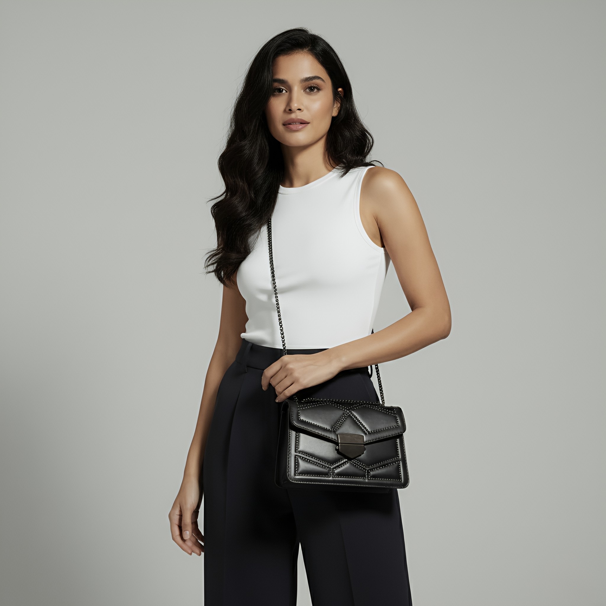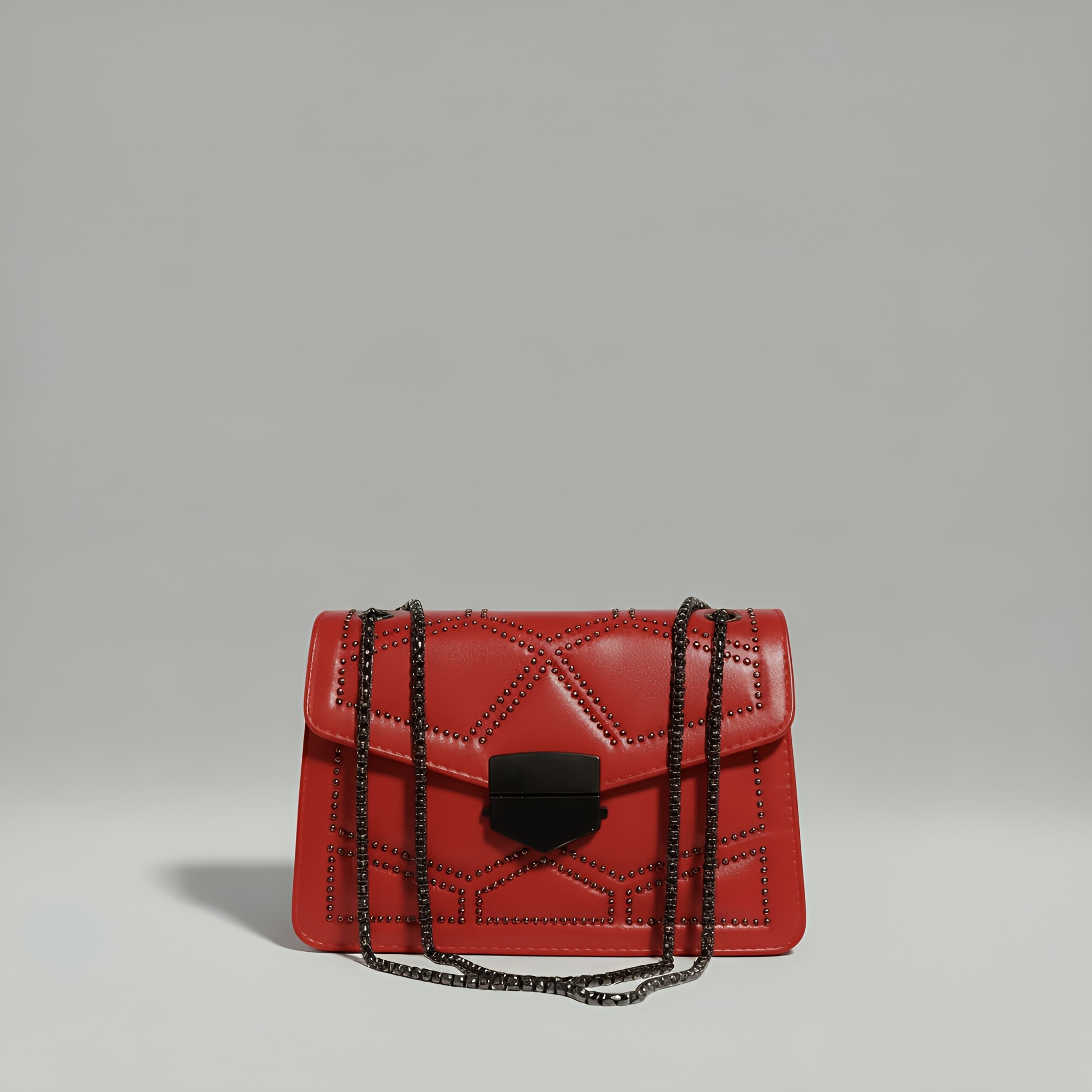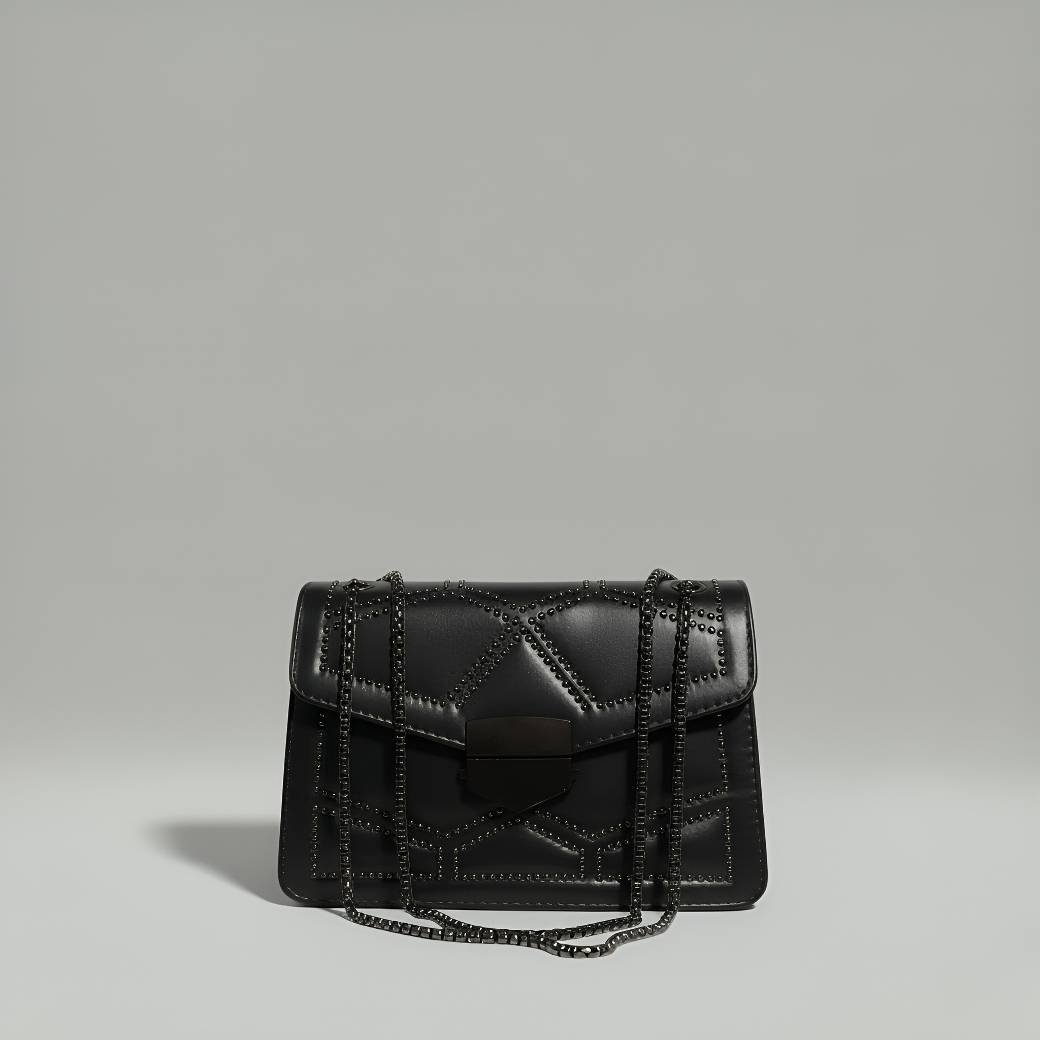 Statement Design – Geometric studs and an elegant chain strap bring edge and elegance together.